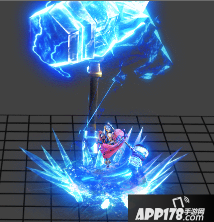 技能3是控制技能——吸附电场,分为三段攻击,第一下为举起大电锤制造电场,第二下放出一个拉扯的特效,第三下将范围内的目标都拉到身边。