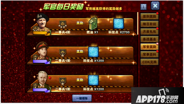 最后,小战提醒一句,每个军官每天都能领科技点和燃油哦,数量根据军官的军衔等级来决定。