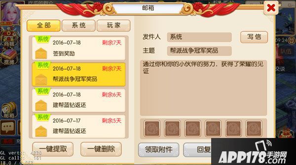 邮件内的附件可以按“一键提取”领取。未领取的邮件无法删除。