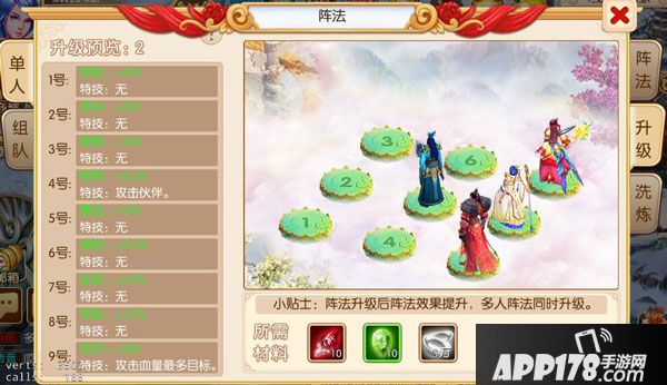 玩家可以在阵法升级界面消耗一定材料来提升阵法等级,增强阵法属性,但是特技无法改变。