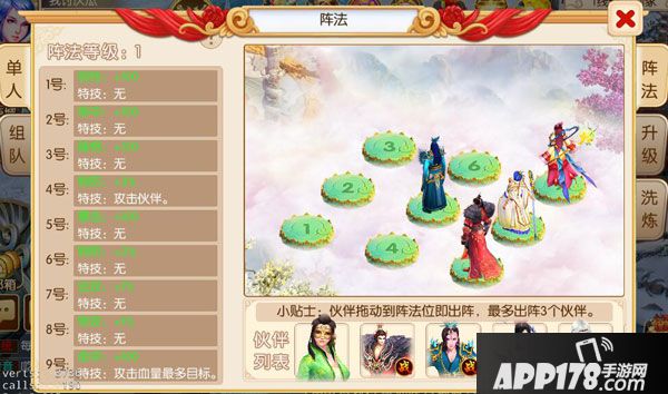 阵法共有九个阵位,主角位为8号位不能移动,伙伴可以随意移动。