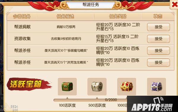 接受帮派任务后,完成任务便可领取相应的奖励。(入帮当日不可领取任务)