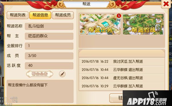 帮主可以分配帮派职位给帮内人员,也可将其踢出帮派。如果是自己退出帮派,要过一定的时间才可再次加入帮派哦帮派系统是以凝聚玩家,增加玩家互动为基础,增加团队配合活动,体现人的价值而出现的。下面小编就给大家来介绍一下《乱斗仙剑》中的帮派系统吧~