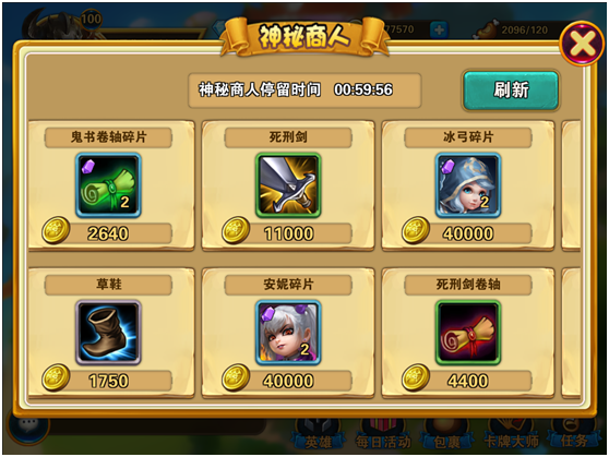 神秘商人每次会待1小时,期间玩家可以无限次进入神秘商店。神秘商店中会贩卖极其稀有的道具,有些需要玩家消耗一定的钻石来购买。神秘商店一次会刷新12个商品,同样,玩家也可以通过消耗钻石来快速刷新商品。