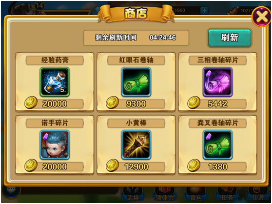 商店每次陈列6件商品,每隔一段时间,商品会自动更新一次。玩家也可以点击“刷新”按钮消耗钻石直接刷新商品。