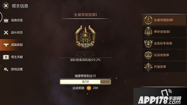 资源采集、研究科技、城池攻占不光能提升王国实力,还能激活相应的成就,获得对应的成就勋章和属性加成。