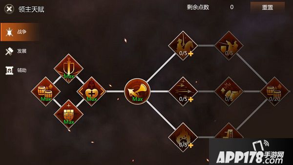 在列王时代游戏中,领主升级后会获得天赋点,用天赋点升级相应的天赋可以获得属性提升。领主技能一共有三个分支,分别是战斗、发展、辅助