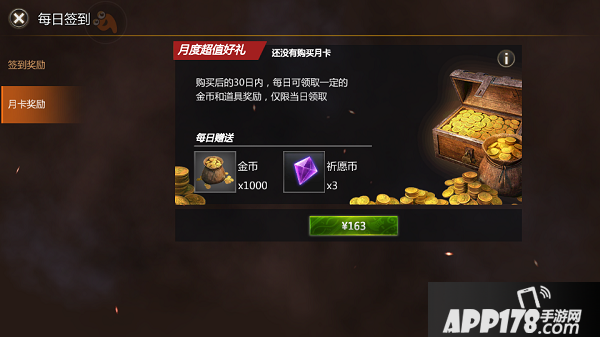月卡一次购买,30天受益,每天进账1000金币和3个祈愿币,足以让你奔小康 !