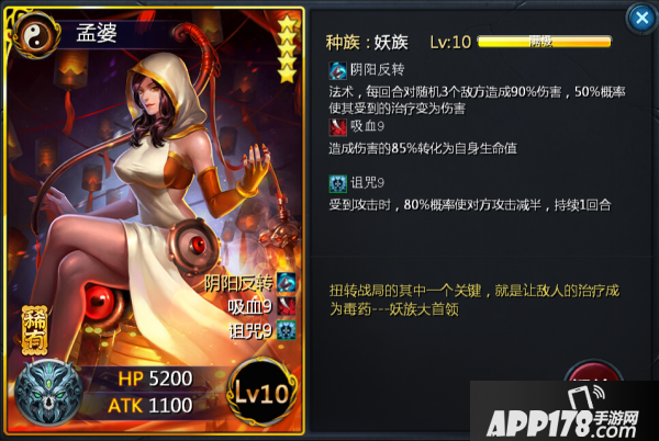 孟婆,看似伤害不高的“阴阳反转”,效果确实让人畏惧,50%的概率使其受到的治疗量变为伤害,试想一下一个回血卡牌给队友群体加血2100的时候,变成了伤害了,那就比较郁闷了!孟婆还有一点强劲之处,就是它的诅咒技能,有很大几率会令一些爆发卡牌瞬间哑火,面对一些连击的卡牌时候,第二段伤害攻击也会减半的哦,持续1回合,再加上它吸血技能的存在,下回合就有可能把生命值吸回来了。
