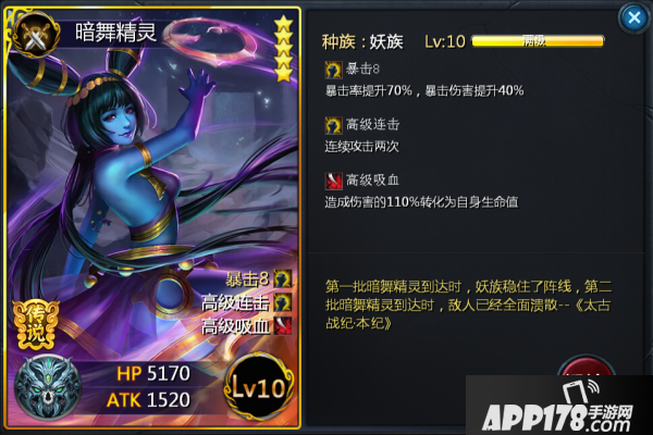 暴击、高级连击、高级吸血,简单的技能结合,却丝毫不难看出它的强劲之处,高额的攻击力+暴击技能,在场上先手对位血量较少单位时,上一个就可能死一个,若不是肉,试问谁能挡它?即使后手攻击,它的高级吸血技能以及爆发,轻而易举就吸回来了。