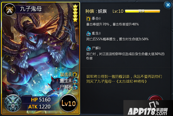 九子鬼母是很具有妖族特色的一张卡牌,暴击的特性增强了输出能力,尸解又能在死亡刹那对敌方造成成吨的伤害,重生赋予了它无与伦比的续航能力,在面对一些高爆发的卡牌会有意想不到的效果哦,且相比仙族“轮回”技能回到援军,妖族的重生是直接复活在场上,显而易见,这点更为好用。