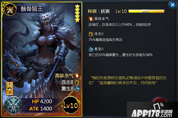 骸骨狼王,妖族高爆发的卡牌,高级杀气,进场即提升60%的攻击了,持续3回合,本身攻击力成长就颇高的狼王,再加连击技能,哪一个肉能扛上3回合呢?骸骨狼王的爆发加重生,无论首发出场和作为援军出场,作用都非常明显,推图PK两不误~