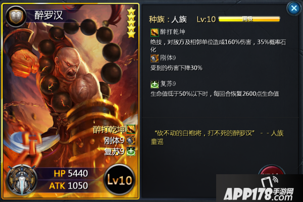 醉罗汉的定位是一个有控的肉盾(天外天五重天掉落碎片),绝技伤害不俗,且攻击相邻单位并概率石化,属于小范围控制。“刚体”和“复苏”保证了醉罗汉的站场能力,而且“复苏”是自身恢复生命,并非治疗,所以类似孟婆的治疗转伤害的技能无法作用于醉罗汉,只要生命低于50%血量,每回合会必恢复血量。