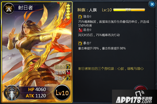 射日者是一个极品的补刀单位,可在天外天七重天刷出碎片。作为四星卡神射手的高级版,射日者无论站场能力还是输出伤害都比神射手要高出一大截,虽然较神射手少了“振奋”特性,但“暴击”的存在使其更加符合补刀的定义,可谓是箭无虚发,箭箭致命,可想而知,触发“暴击”和“狙击”的射日者攻击到敌方血量较少的脆皮身上,想不死都难。