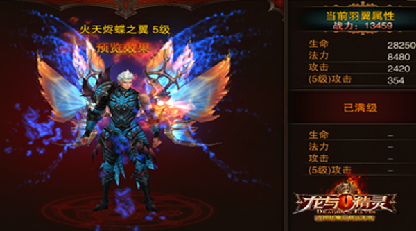 “火天烬蝶之翼”具有生命、法力、攻击三种属性加成,此外,还有高额的战斗力加成,有了它的支持,勇士们在战斗中必将披靳斩棘,如虎添翼。