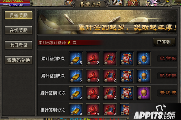 月签奖励:每月登陆游戏签到一定天数可获得对应奖励,每月所有奖励领取完后次月重置可再次签到领取