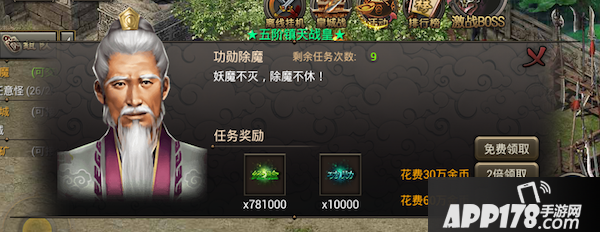 除魔任务为简单的杀怪任务,消灭指定数量指定怪物即可完成任务。该任务有星级之分,星级越高奖励越多,只要花费少许金币即可刷新星级,建议玩家在接取任务前先刷出十星任务且提交任务时多倍领取哦。完成除魔任务可获得大量经验和功勋,不仅能升级,还能升功勋称号增加属性,所以除魔任务每日必做哦!