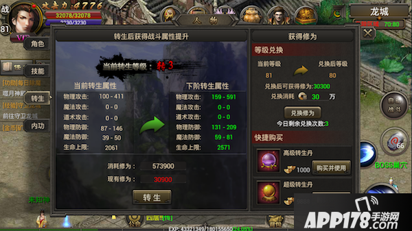 玩家达到80级开启转生,转生等级提高可以进入高等级地图、高级转生神殿,可以使用更强大的转生装备,所以在提升等级的同时也要提升转生等级哦。