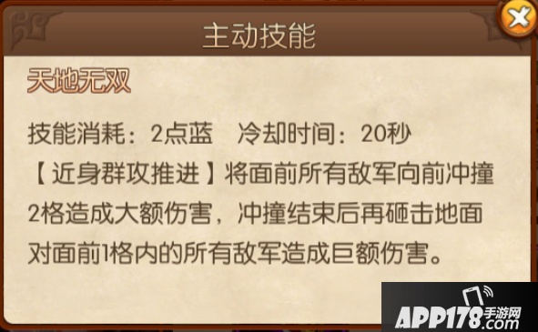 首先吕布主动技能“天地无双”冲撞所有前面敌军,击退2格,冲撞结束后直接用方天画戟砸面前1格内所有敌军,这个技能总共有2次伤害,冲撞会造成一次伤害,而真正的伤害来自吕布砸向地面的一击,伤害爆炸!这个技能可以有效的打断,击退敌人,并且造成爆炸伤害,但并非是完美的。吕布的主动技能缺陷在于前置动作时间太长,导致例如在巅峰对决中比较容易被对手躲开,如果有马超这么快速的出招,堪称完美!