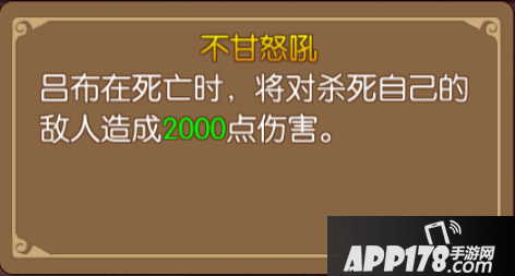重点说一下不甘怒吼这个技能,看技能名字类似lol“蛮子”的R,但并不是。不甘怒吼技能效果为吕布死亡的时候,会对杀死自己的敌人造成2000点伤害,伤害数值提升而提升,这是个非常恐怖的技能,如果是谋士或者是弓箭手打死吕布,非死即残。在吕布开启这个技能后吕布就变成了一个炸弹,要将这个技能的伤害降到最低取决于谁打死吕布以及医生的技能是否跟上。
