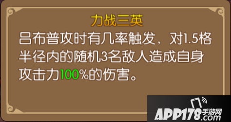 力战三英是比较普通的被动触发式的群攻技能,有几率对1.5格半径随机3个造成伤害,基础是100%,伤害数值随技能提升而提升,对于吕布的这个将印技能要避免的是医生和谋士和吕布的站位距离。