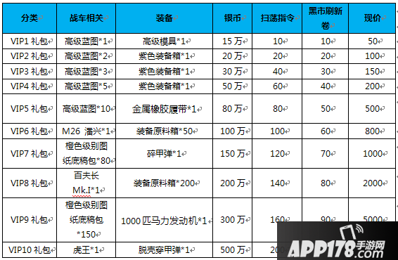 玩家每提升一个VIP等级,都有一次机会以较优惠的价格购买当前等级的VIP礼包。当前版本VIP礼包只开放到10级。详细VIP礼包价格和奖励请见下表: