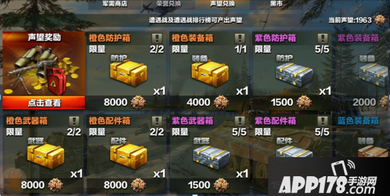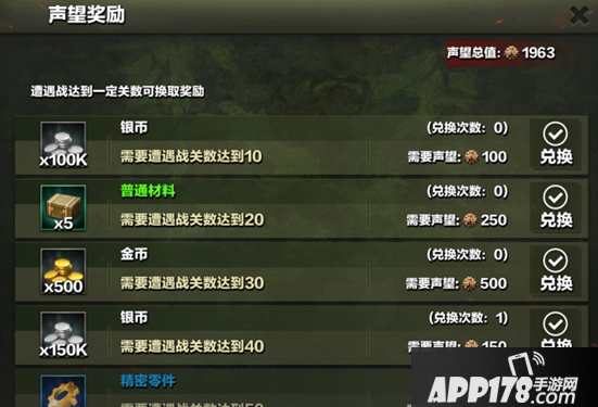 1.遭遇战通过指定的关卡后,就可以在声望商店内以十分优惠的价格,使用声望兑换游戏内的各种稀缺资源,包括金币、银币、钢材、橙色装备箱等。