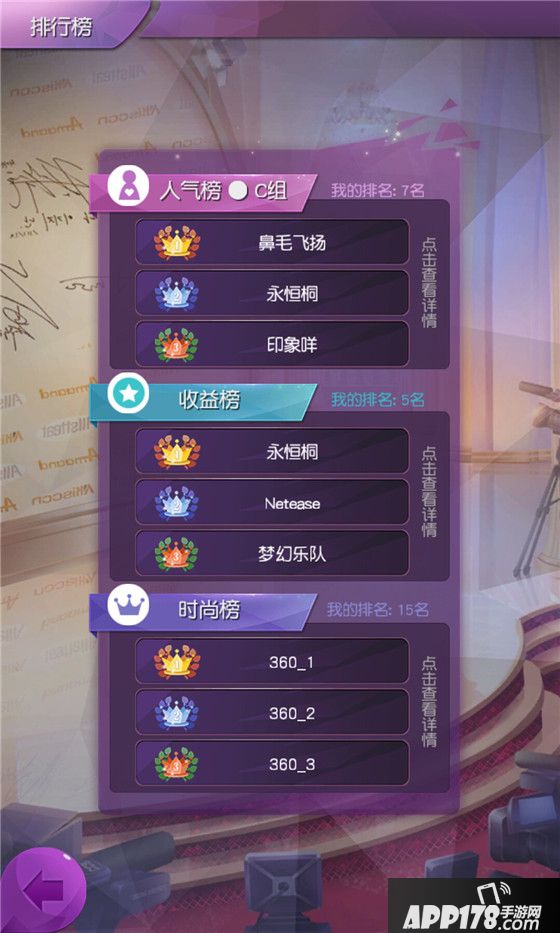 排行榜分为粉丝榜、收益榜、时尚榜三个榜单,玩家可通过左右滑动切换榜单。榜单显示前50名玩家,信息包括:排名、头像、昵称、粉丝数。当玩家在榜单上有可领取奖励时,显示叹号红点提示 。