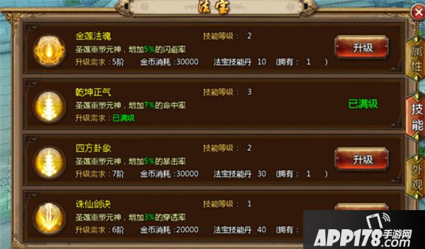 A、 法宝品阶越高可激活的技能则越多,法宝技能属于被动技能加成主角的额外属性如一阶技能金莲法魂增加生命上限,八阶技能增加整体攻击伤害,每种技能通过法宝技能丹升级,获得更好的属性。