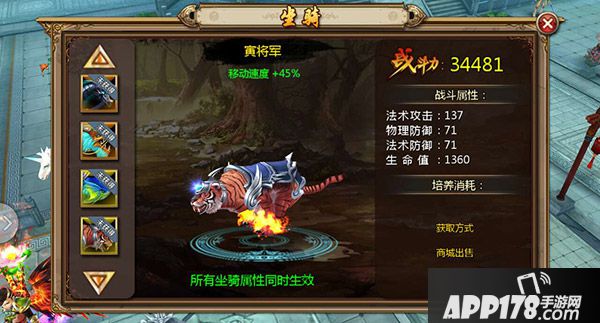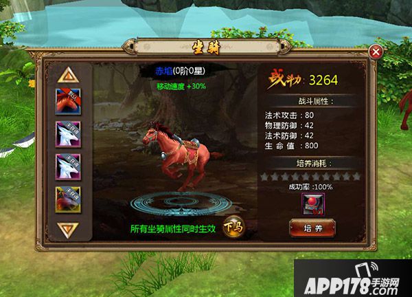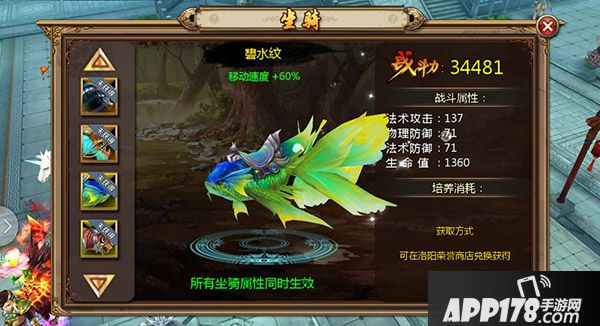 坐骑是具有成长性的。培养坐骑,坐骑对人物的属性加成也会提高。所以,依照自己的财力和能力,选择最适合自己的坐骑是很重要的。