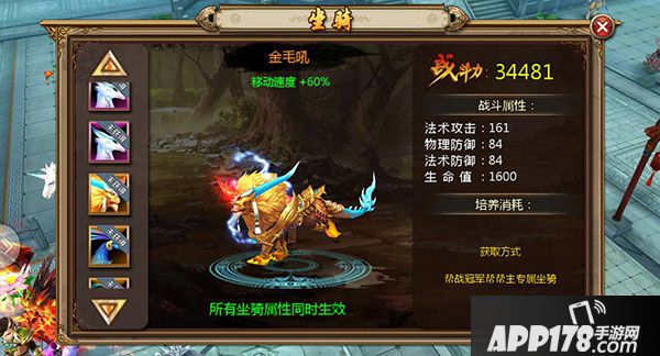 获得方式:帮会战挑战冠军帮帮主获得专属坐骑。