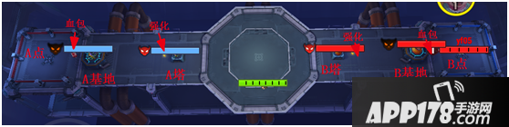 比赛之前,先来看看基地保卫战的布局图。红蓝两队被分布在地图的两端,A点、B点分别是红蓝两队的出生点。每队各拥有一个防御塔、一个基地,其中在防御塔被摧毁之前基地是无敌的,而基地被摧毁则会直接导致比赛的失败。防御塔、基地背后各有一个强化弹药包和回血急救包,防守方可以利用这些资源有效加强防御,同时需要警惕撤退可能导致的资源被进攻方盗用。