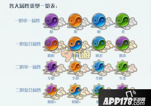 在游戏中主要分为单一属性。就是阴、阳、刚、柔。还有各种复合属性。复合属性比较多。