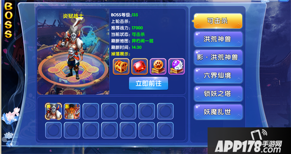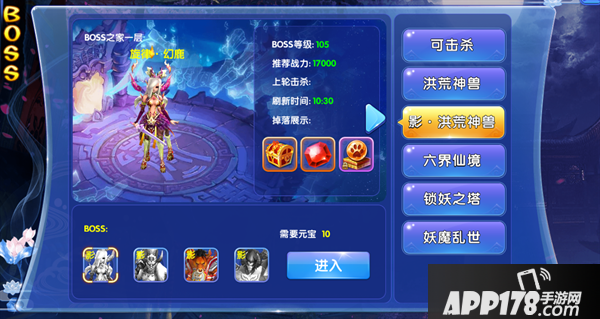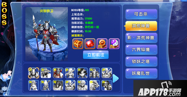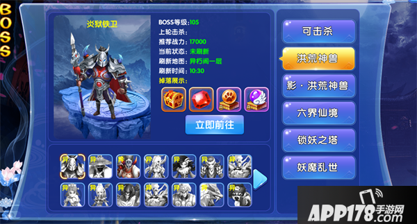洪荒神兽:这里显示的boss都在异朽阁,异朽阁每层都会有boss,而且随着你等级的提高,异朽阁的层数也会逐步开放,让你能挑战更强的boss和获得更好的奖励!要注意的是这里的同等级段boss是需要组队才能击败的强力boss