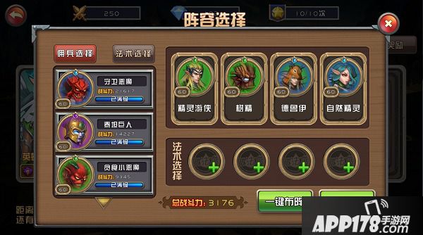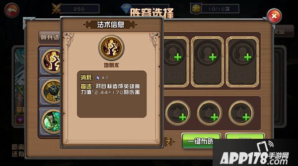 玩家可以通过左侧的佣兵选择,进行佣兵上阵,也可以点击法术选择,进行法术佩戴
