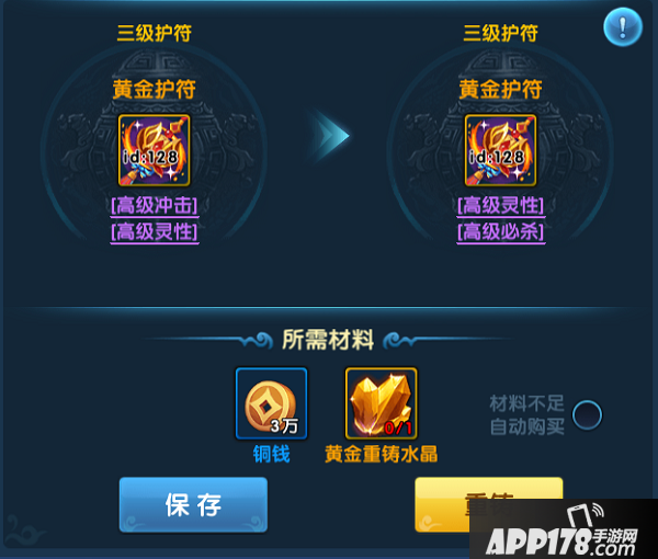 护符可以靠合成来改变护符拥有的技能数量。例如:2个1技能的黄金护符,有几率可合成2个高级技能护符。