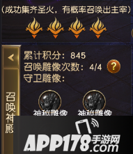 温馨提示:召唤次数越多召唤概率越大,若达到4次召唤次数,并集齐4个圣火,必然会召唤出主宰BOSS。