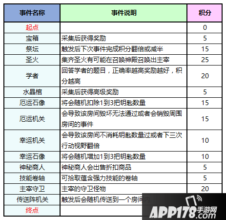 2)每个房间会随机一个事件,完成房间事件后会获得对应的积分,所以大家要尽可能多的探索房间、完成房间事件,才能获得高积分,完成不同事件可以获得不同数量积分哦。(积分是召唤神殿BOSS的关键!)