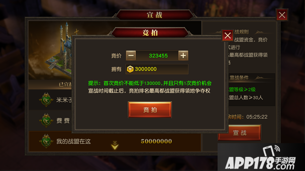 当一块领地受到多个战盟宣战时,就需要通过暗拍的形式抉择出最终的对战双方。宣战时,战盟需要花费一定数量的战盟资金对领地进行竞拍。最低起价13万资金,若资金不足,则由钻石补足。宣战时间截止后,竞拍价最高的1或2个战盟获得争夺该块领地的资格。一个战盟只能对一块领地进行竞拍,且竞拍机会只有1次,竞拍后不能再次修改价格。