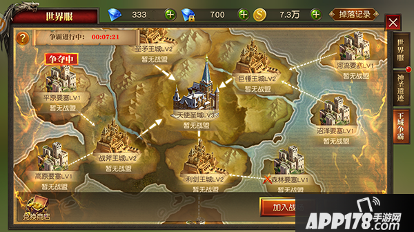 王城争霸是世界服多个服务器的许多家战盟之间的争夺战场,是以一个战盟VS另一个战盟的形式进行对抗。王城争霸并非随机分配对战双方,而是以抢夺领地并宣战的方式进行分配的。