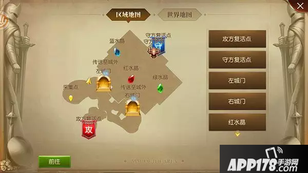 战场中共有一左一右两个城门,想要抵达守方阵地取得胜利必须击破城门才可以前进。攻守双方都会城门阻挡,不得自由通行。但守方可以灵活运用传送点,传送至城外进攻攻方阵地。同时,攻方也可以攻击城门,血量为零时,城门将会破碎,阻挡功能失效。
