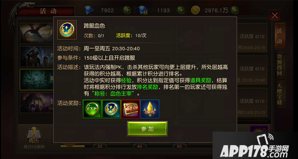 5. 跨服血色争霸最终根据积分进行排名,积分越高排名越高,所能获得的奖励越高。