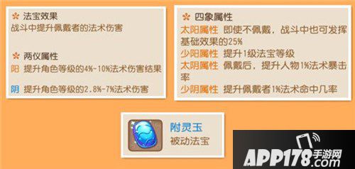 附灵玉:战斗中提升佩戴者的法术伤害。四象属性一般是选择少阳,提升1级法宝等级就相当于直接提升伤害。土豪会选择太阴,提升1%的法术暴击率。