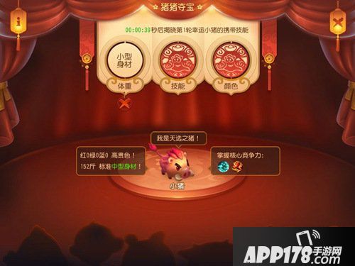 2.每轮会公布幸运小猪的三个指标,包括体重、颜色、携带技能。