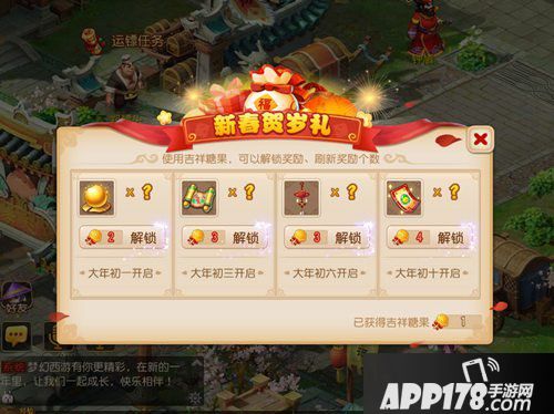 活动介绍:春节活动开启后,玩家可获得梦幻贺岁礼,其中包含新春经验礼、新春贺岁礼、新春开运礼、新年有约四重大礼。玩家只要在大年初一、大年初三、大年初六、大年初十登录游戏即可解锁相应的贺岁奖励,消耗一定的吉祥糖果刷新奖励数量可以获得更多的道具奖励哦!