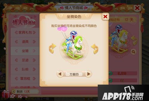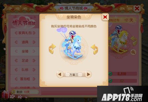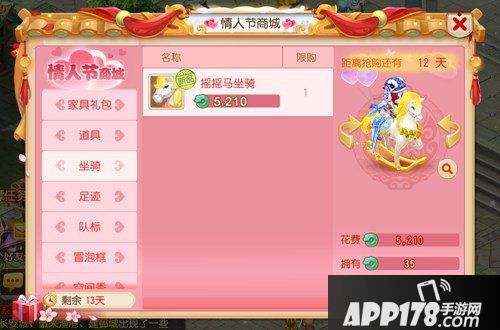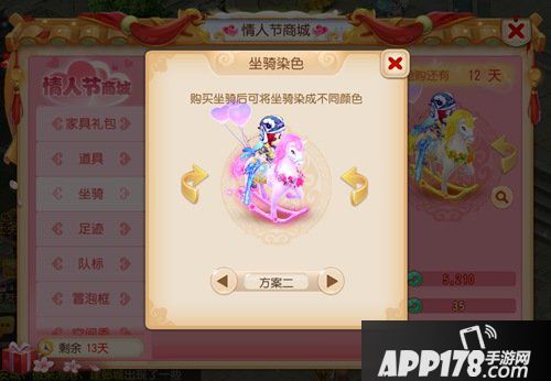 终于敲定:在2月13日16:00~2月14日24:00大家都喜爱的双人坐骑摇摇马将率先上架情人节商城!每人仅限购一只,但重点是!不限量!不限量!不限量!没错,也就是不需要挤时间抢购在指定时间内人人皆可购买。