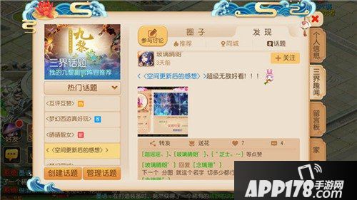 在个人空间的三界趣闻版块,玩家可以通过浏览、参与话题“空间更新后的感想”,与其他玩家分享对于新版空间种种意见。