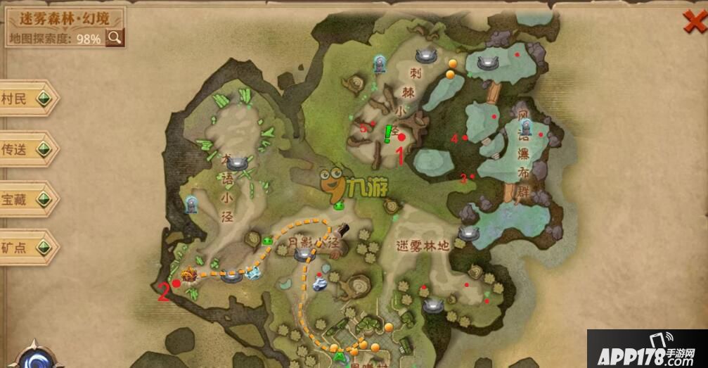 迷雾世界迷雾森林地图隐藏宝箱位置如下图,其中任务过程会开掉两个,剩下的宝箱位置在图中红点标示。中间绿色的两个是小精灵位置,还算明显一般不会漏掉。