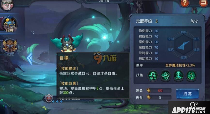 技能效果:被动,提高魔抗和护甲6点,提高生命上限300点。
