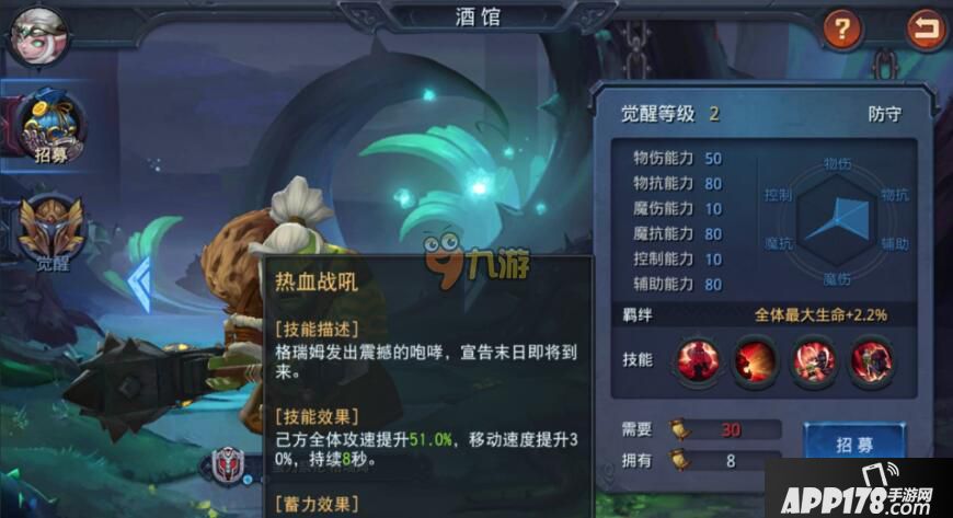 技能效果:己方全体攻速提升51.0%移动速度提升30%,持续8秒。